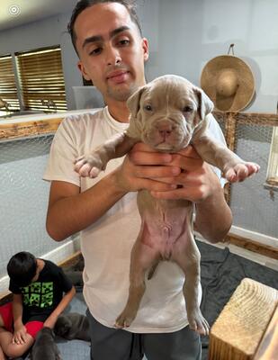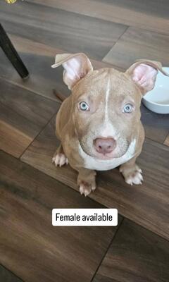 Blue brindle male And a champagne colored female ABKC registered Mother and father are pictured m...