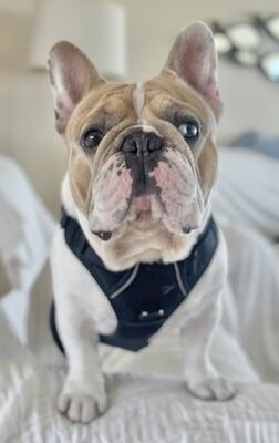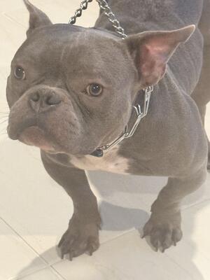 Big head stocky pied French bulldog with blue eye. Blue fawn Merle pied. 4 panel health Clear. Fa...