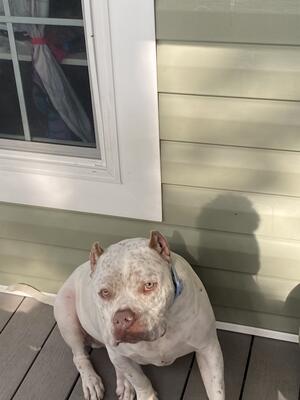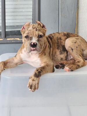 Looking to rehome a one-year-old blue and white brindle male who is very sweet and loves kids Contac...