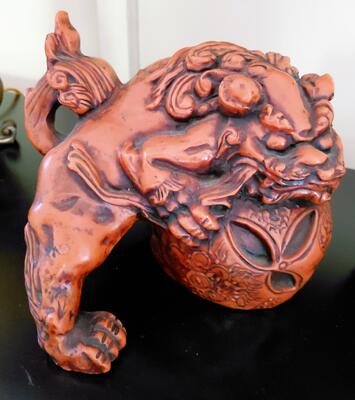 These vintage Chinese Foo Dog figurines are crafted from red resin, symbolizing good luck and protec...