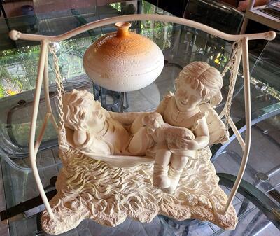 Pair of Asian Baby Laying on top of a Koi Fish Figurines