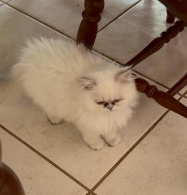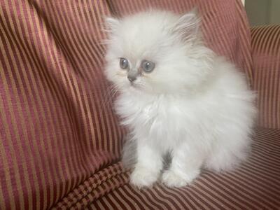 Pure white Persian girl kitten with blue eyes. Her nose and paw pads are pink. Her personality is ca...