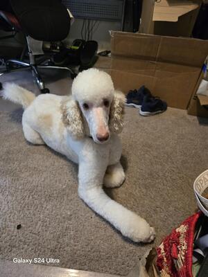 He's a pure bred standard poodle 2 years old with shots and vet records and house and cage trained ...
