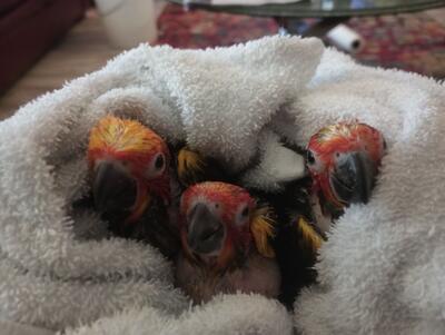 Sun Conures babies hand fed