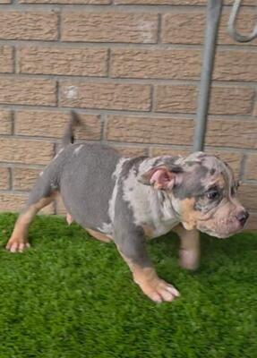 ABKC American Bully Merle pup very extreme solid build. We have 2 litters on the way so price is red...
