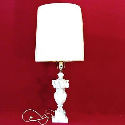 Here is an antique white marble table lamp with lampshade. It has a nice hand crafted leaf, ring aro...