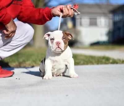 Beautiful male, chocolate tri color, full tail, miagi blood, super thick and compact ...