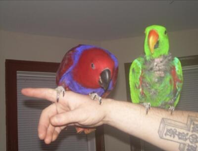 Pair of bonded eclectus. Just put make in with her last year and she''s sitting on 2 eggs as we spe...