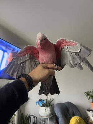 1 1/2 yr old cockatoo PrettyBoy. Loves to talk, whistle, give kisses and dance. Comes with cage, pe...