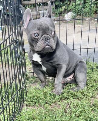 3 exotic frenchie puppies. White black and blue is a female. Blue and tan with one blue eye is a fem...