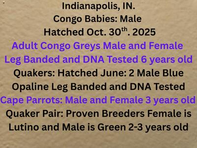 Meet and greet and Cash. NO SHIPPING AT THIS TIME! Congo Grey Babies: $6500 each. Congo Greys 6 y...
