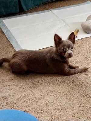 Beautiful longhair chocolate blue eyed female chihuahua. She is 1 year old, spayed, UTD on vaccines...