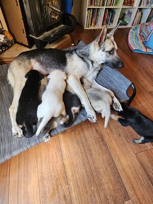 The best of both worlds made babies!! Our Pitsky (pit husky) and rescue German Shepherd made babies....