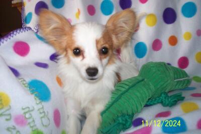 Lemon/White Papillon puppy. Born June 11. 2024. Sire is an AKC Grand Champion, Dam is pointed in AKC...