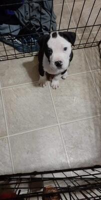 6 month old pocket American bully amazing with kids, cats, and other animals. Potty trained, and cra...