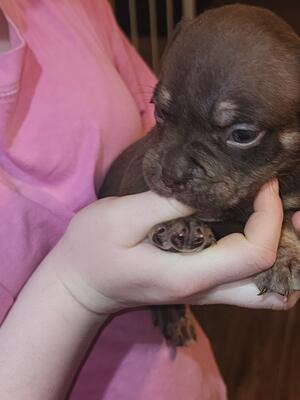 1 Year old ABKC registered Chocolate Tri pocket Female.