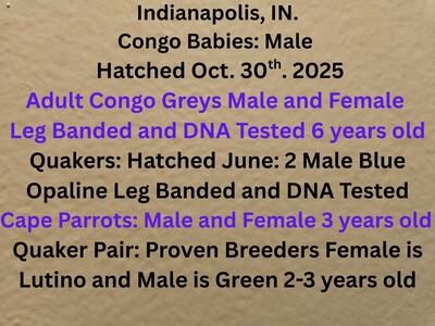 NO SHIPPING! Location South West side of Indianapolis, IN. FEMALE IS PENDING: Male hatched Oct. 3...