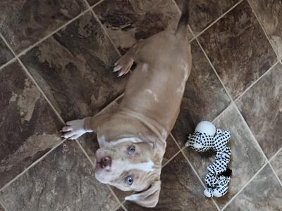 American Bully Chocolate Merle Male. He is ready to go. Mom is a Standard Lilac. Dad is a Brindle Me...