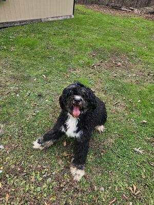 Very high energy. Bernese mountain dog poodle mix. She is very energetic. Takes time to get to know ...