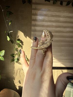 This is an 8 month old crested gecko. They are Lilly white. They can come with their 10 gallon enclo...