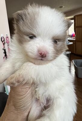 I have a male Pomeranian puppy born 3/11/2025. He is tri chocolate with merle markings. He is a swe...