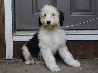 Here is Jonson a Black & White (Male) Aussiedoodle, Born April 29, 2025 He should be ready to go hom...