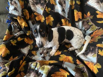 What a cutie! Roscoe is a black and tan piebald smoothcoat miniature dachshund. He was born 05/29/2...