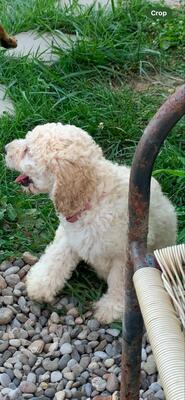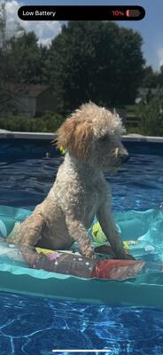 Bertha is a small mini [poodle-mom is red AKC 10 pound mini poodle-dad is white CKC male 8 pounds-sh...