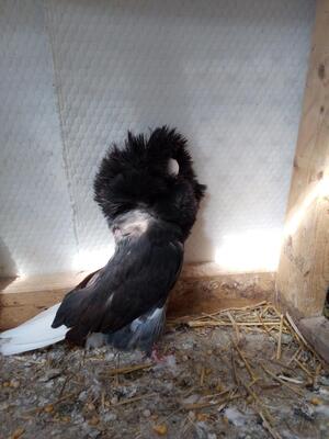 Pair of Jacobin pigeons, black hen & red cock - $250 PRICE REDUCED (price includes shipping and box ...