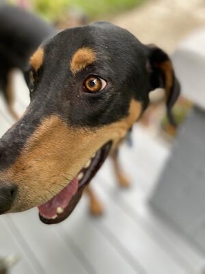 Looking for a family with other dogs or children interested in an adult male Doberman. He is very do...