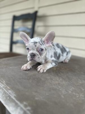 Say hello to this adorable 10-week-old male merle French Bulldog! With his striking coat, sparkling ...