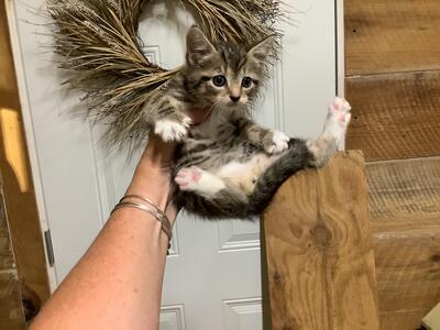 Grey tabby with white...domestic shorthair. Litter trained. Very sweet and friendly. 8 weeks old. Re...