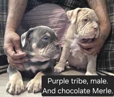 Blue tri pocket bully pups born 10/03/25. Utd on shots and dewormed. ABKC Registration in hand...