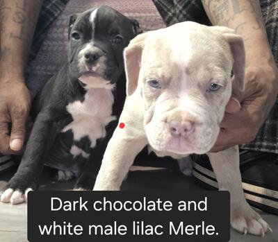 8 week old Xl American Bully Male lilac Tri. ABKC papers Shots. dewormed. Great temperament great wi...