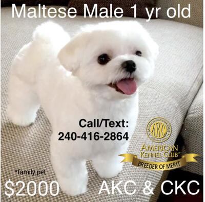 Maltese Male call:(571)409-1844, 1 yr old, purebred dual pedigree AKC & CKC ** If you can't affo...