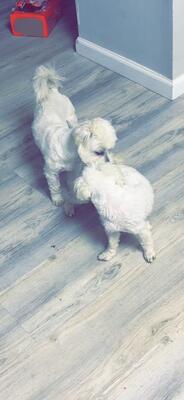 2 white maltipoo adult female sisters that are 2.5 years old in need of a new home. Will come with k...