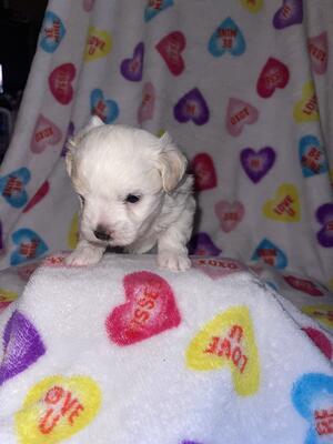 Adorable male puppy born on February 11, 2025. Potty trained to go outside, but also goes on pee pad...