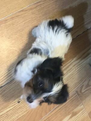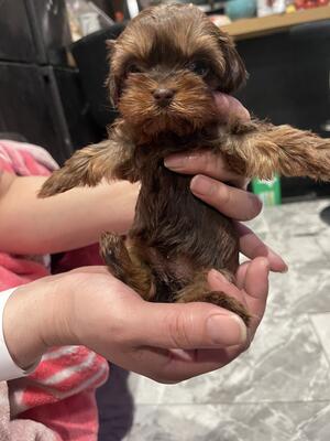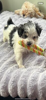 This little guy is yorkie/poodle/Australian Shepherd all teacup and toys so will stay under ten poun...