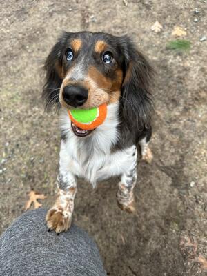 My 9 month old long hair blue dapple piebald dachshund boy is ready to get his groove on! He is 12 l...