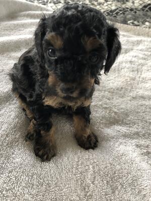 AKC. female toy parti poodle black and white. DOB-December 2024. Crate trained. Dog door trained. H...