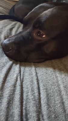 He''s a pit/lab 3 years old. Super friendly and loving. Crate trained. Good with kids and small dogs...