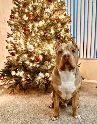 I have a magnificent Lilac Tri-Merle Standard American Bully named Zhen. He is 1yrs old and weighs a...