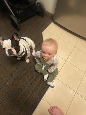 Very sweet. Loves to play . Good with kids. Gets along with other dogs. Not completely potty trained...