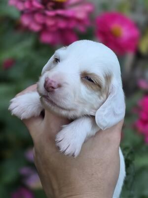 Long hair mini dachshund male. Cream and white piebald. Pups will be raised in my home with children...