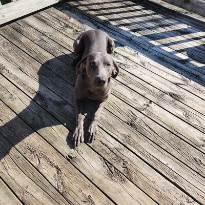 Grey Weinmaraner 3yr 2 months He is sweet and fun loving . great around kids and people gentle dog ...