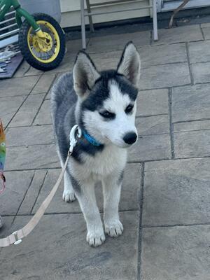 8 month old husky puppy he has all of his shots and is Akc satisfied. He also does have a microchip ...
