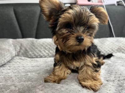 This tiny traditional Yorkie boy is way too adorable for his own good! He’s high quality with cham...