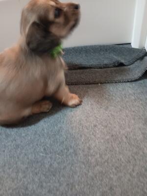 Long hair mini dachshund male. Cream and white piebald. Pups will be raised in my home with children...