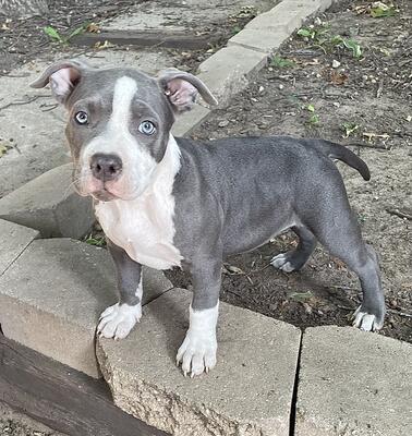 I have a 4 year old bullie named mister. He is sweet loving dog. He is great with kids and other dog...