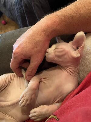 10 month old female sphynx/dwelf cross. Her body is like a sphynx and her little ears are curled s...